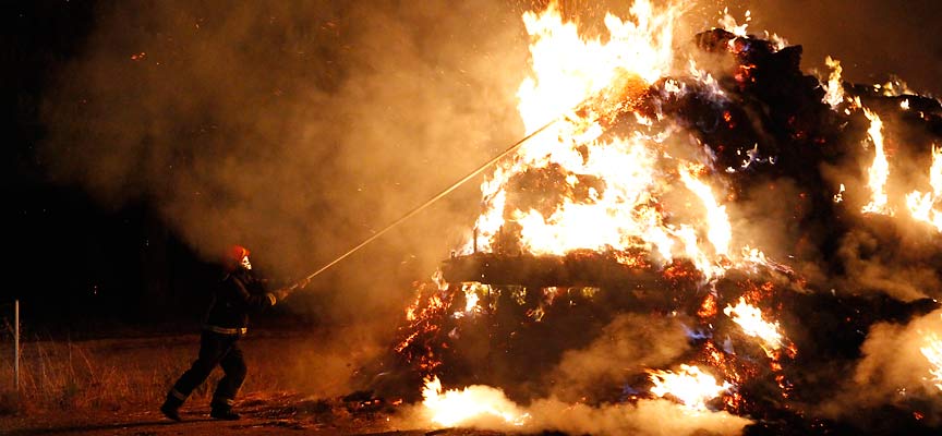 Hasta el lugar del suceso se han desplazado los bomberos de la Comunidad de Villa y Tierra de Cuéllar con dos motobombas y un camión cisterna, y con ayuda de algunos vecinos con maquinaria han trabajado para extinguir el fuego y separar las pacas para poder enfriar y reducir la combustión de las mismas. Unos trabajos que se presumiblemente se extenderán durante varias horas.