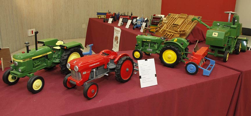 En total pueden verse nueve tractores de las marcas Saca, John Deere, Lanz, Lanz Bulldog, Barreiros, Massey Ferguson, Ebro, con su arado, abonadora, sembradora, rodillo, cultivador o remolque, una cosechadora (John Deere) y una beldadora o aventadora con la que se limpiaba la parva después del trillado, separando el grano de cereal o leguminosas de la paja o impurezas. Además se muestran algunos utensilios como palas, rastrillos, azadas… tallados también en madera.