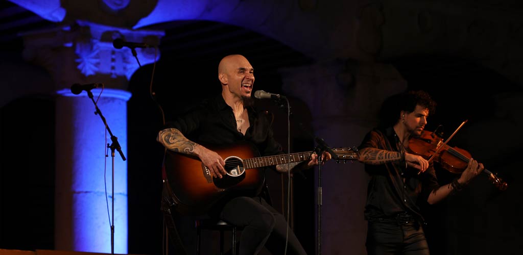 Una fantástica noche de verano recibió en el patio de armas del Castillo de Cuéllar a Carlos Escobedo, cantante del grupo Sôber, aunque esta vez en versión acústica acompañado por su guitarra, un teclado y un violín tocados por Raúl Verona y Charly López. El concierto se enmarcaba en su gira ‘En estado puro’.