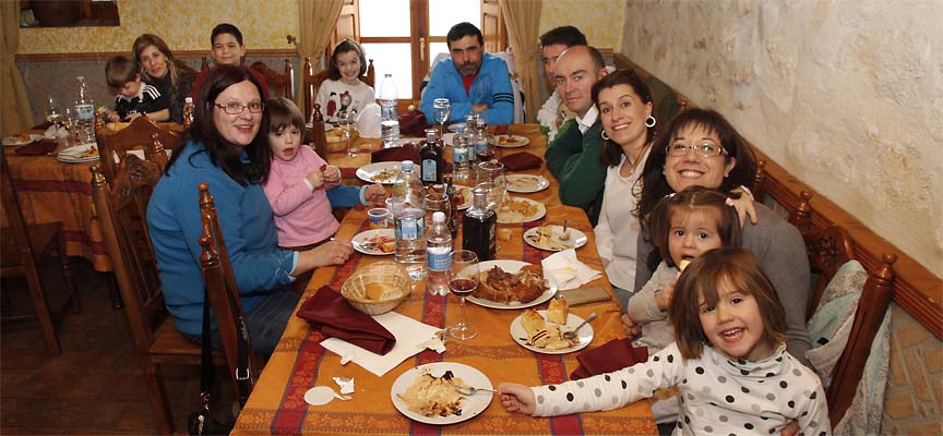 El cocido lo hemos podido degustar en tres vuelcos: primero se ha servido la sopa con fideos, después han llegado los garbanzos (de Cogeces) a cada comensal junto con un trozo de cebolla y repollo, y el tercer vuelco estaba formado por las carnes troceadas, costillas de cerdo adobadas, chorizo, morcilla, oreja, tocino y rellenos. Vino de la Ribera del Duero y agua para acompañar al cocido, bizcocho con manzana y leche frita en los postres y licor de arroz con leche y orujo gallego tras el café, han completado la comida. Todo ello acompañado del excelente trato de los propietarios del restaurante y casa rural, Modesto y Yolanda.
