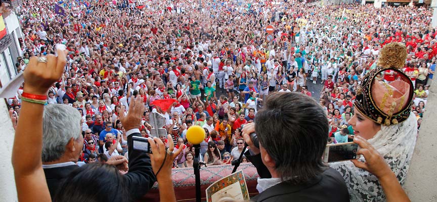 [blocktext align=”left”]…y antes de que se vayan: ¡Cuellaranos¡ ¡A por ellos!”[/blocktext]Les ha animado a celebrar y festejar. “Nuestras gargantas están sedientas de alegría festiva. Nuestros corazones ya laten más fuerte y deprisa al ritmo de la fiesta” ha exclamado anunciando el final de su intervención. “Ya modulan las dulzainas del danzar y del disfrutar. Pero es que… ¡Ya han pasado La Vega y El Quemadal!, ¡ ya están en Los Arenales!, ¡ Ya los tenemos aquí !… y antes de que se vayan: ¡Cuellaranos! ¡A por ellos!”, ha concluído para hacer estallar de júbilo la plaza Mayor donde se congregaban miles de personas en uno de los actos más multitudinarios de las fiestas.