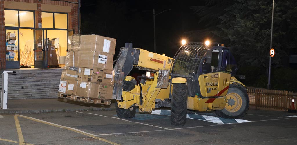 Para mover los palés y cargarlos a los camiones se ha contado con la colaboración de la maquinaria aportado por la empresa local Obralco.