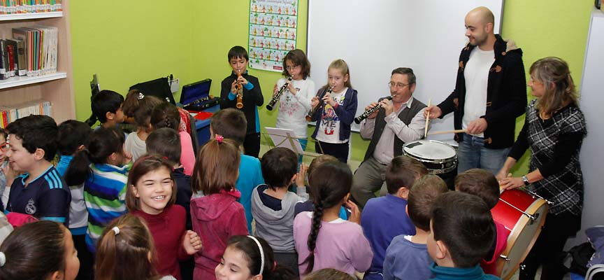 Los alumnos del centro se han distribuído por edades en cuatro grupos que han ido pasando por la biblioteca. Allí los profesores de la Escuela de Música les han explicado porqué Santa Cecilia es la patrona de la música, y no lo es porque tocara algún instrumento sino porque al parecer mientras era martirizada cantaba. Ramos les ha explicado lo que es la dulzaina, sus partes y cuando se toca, y del mismo modo Gascón les ha explicado los usos y funcionamiento del bombo y el tamboril.