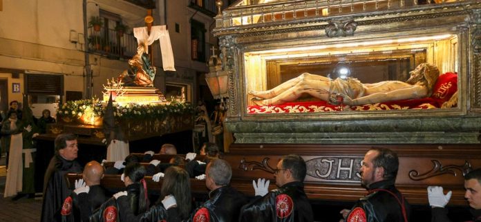 El recorrido concluía con la entrada del Cristo Yacente al son del himno nacional en la iglesia de San Miguel. Instantes antes, ya con todos los pasos dispuestos en torno a la plaza Mayor el sacerdote, Lorenzo Sáez, se dirigió a los cofrades y público que llenaban la plaza invitándoles a entregar el recorrido realizado rezando un padre nuestro “a nuestro señor Jesucristo que derramó su sangre en la Cruz. Hemos contemplado su pasión y muerte para que todos nuestros deseos, todos nuestros proyectos, nuestros sacrificios y todas las ofrendas hechas a lo largo de estos días santos, el señor nos conceda lo que deseamos”.