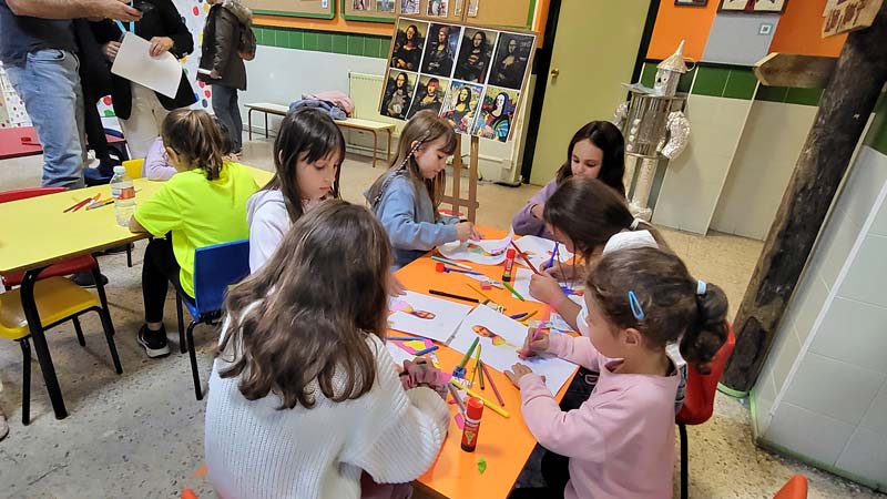 Alumnos y familias pudieron participar en un mural colaborativo recortando papel y creando diferentes figuras. Un taller animaba a los niños a crear su propia Gioconda personalizándola con su propio estilo y otro les retaba a jugar encajando una manzana en el cuadro ‘El hijo del hombre’ de René Magritte.