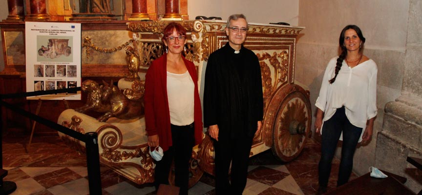 La carroza se exhibe junto al retablo de San Antonio en el templo del Santuario y las propias restauradoras fueron las encargadas de detallar en qué han consistido los trabajos en una conferencia. Así apuntaron que se ha tratado de una restauración que no ha sido grande en cuanto a presupuesto, ha ascendido a 16.177 euros, pero que permiten recuperar elementos de valor sentimental como esta pieza.