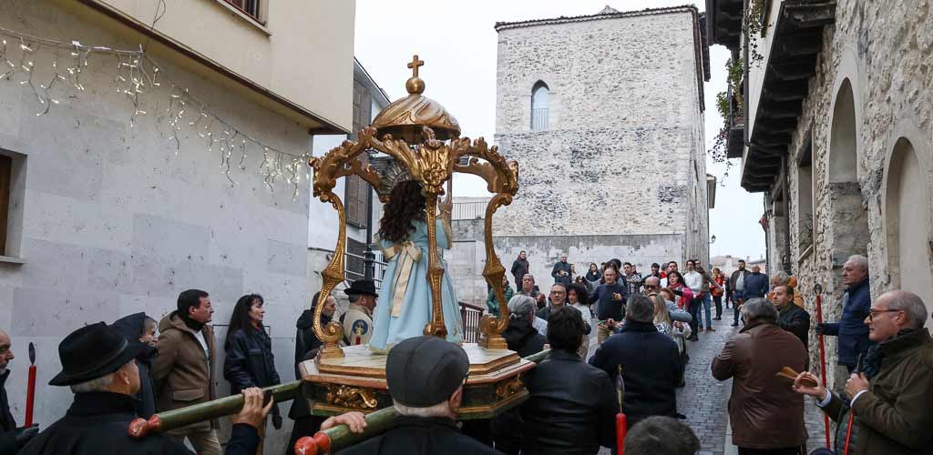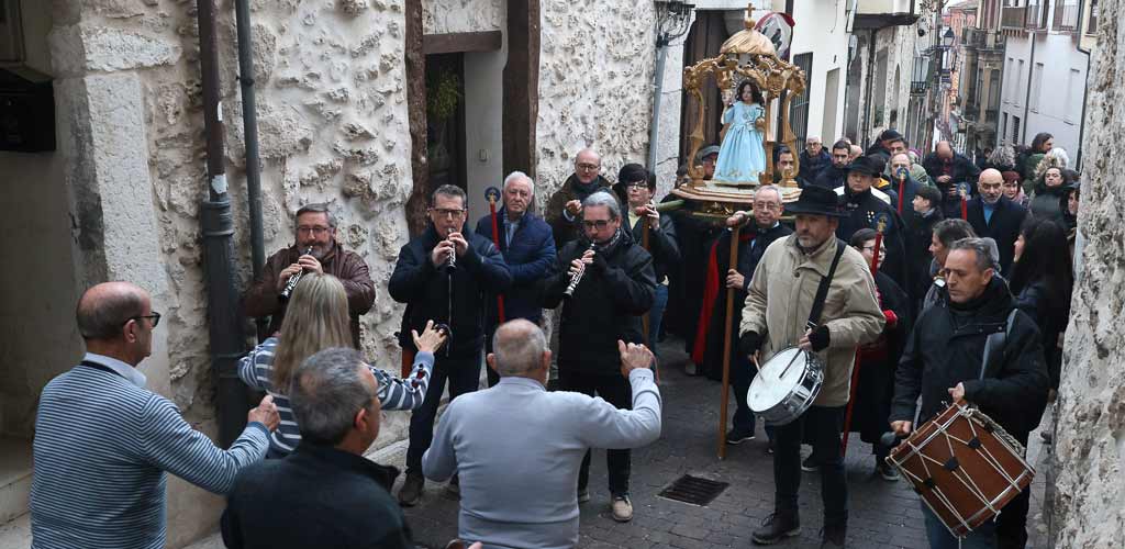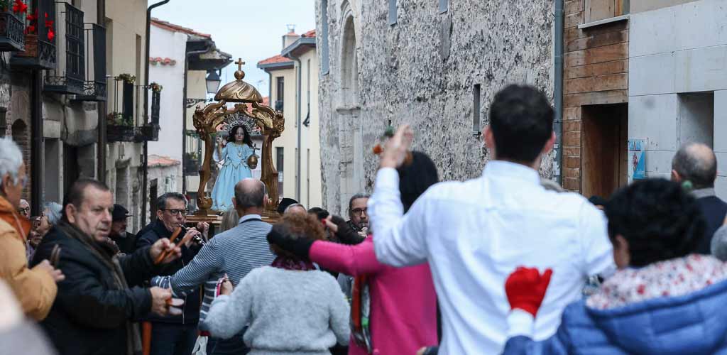 La lluvia cayó de manera leve e intermitente desde primera hora de la tarde, pero no impidió que la procesión se desarrollara de manera tradicional. A las 17.30 horas la imagen abandonaba la iglesia de San Miguel, donde previamente se rezó una oración. El mayordomo, Alejandro Villahoz, fue uno de los encargados de portar en andas la imagen a la salida del templo. Una salida que estuvo acompañada, como el resto de la procesión, por los sonidos de la dulzaina y el tamboril de los Hermanos Ramos. También resonaron las tejoletas.