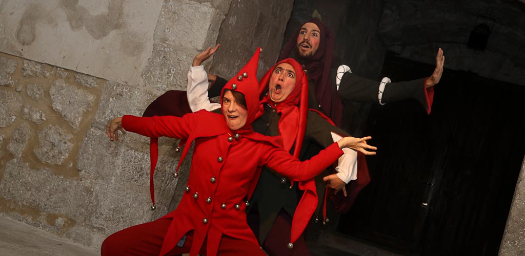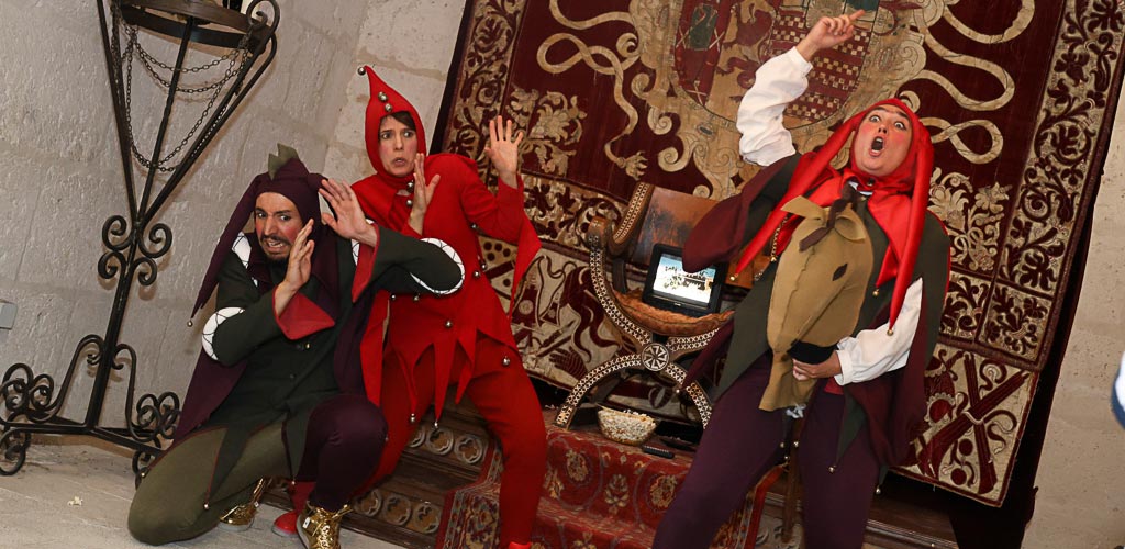 El castillo de Cuéllar permite viajar al medievo al atravesar sus muros y recorrer sus estancias. Unas estancias que son el escenario de un nuevo espectáculo teatralizado que se ha presentado hoy y que tiene como protagonistas a tres bufones inmortales que ofrecen su particular visión de la historia y la fortaleza. La obra puede ya disfrutarse desde mañana.