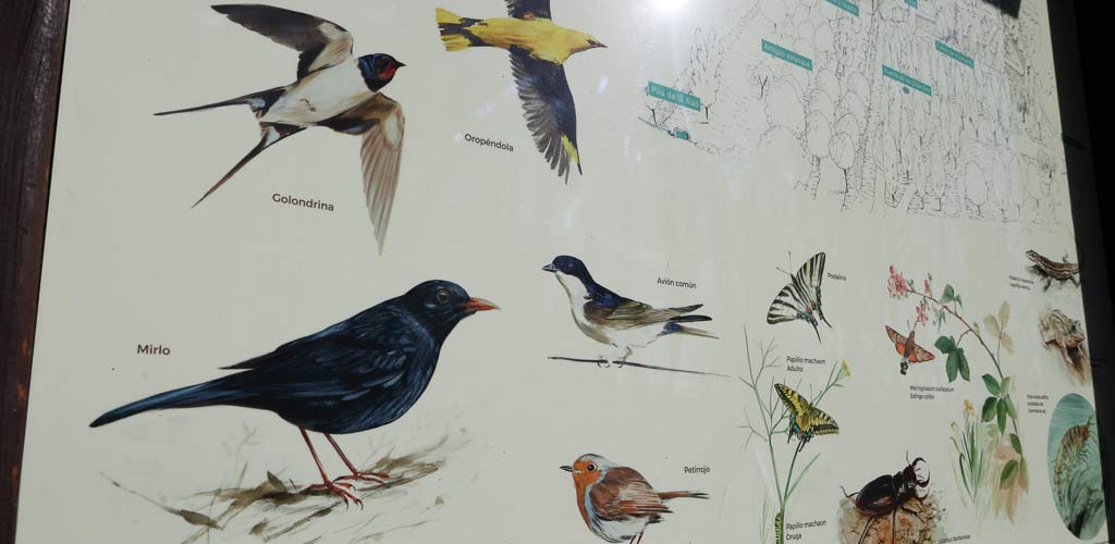 En la alberca de la higuera se ha recuperado un panel en el que se habla del agua y los espacios donde está ese agua: antiguos lavaderos, pileta de la Nao… y se ha querido también representar algunas de las especies de fauna más representativas, principalmente pájaros: petirrojo, avión común, golondrina u oropéndola, además de sapos mariposas, lagartijas o el gammarus especie que certifica la pureza de las aguas del espacio.