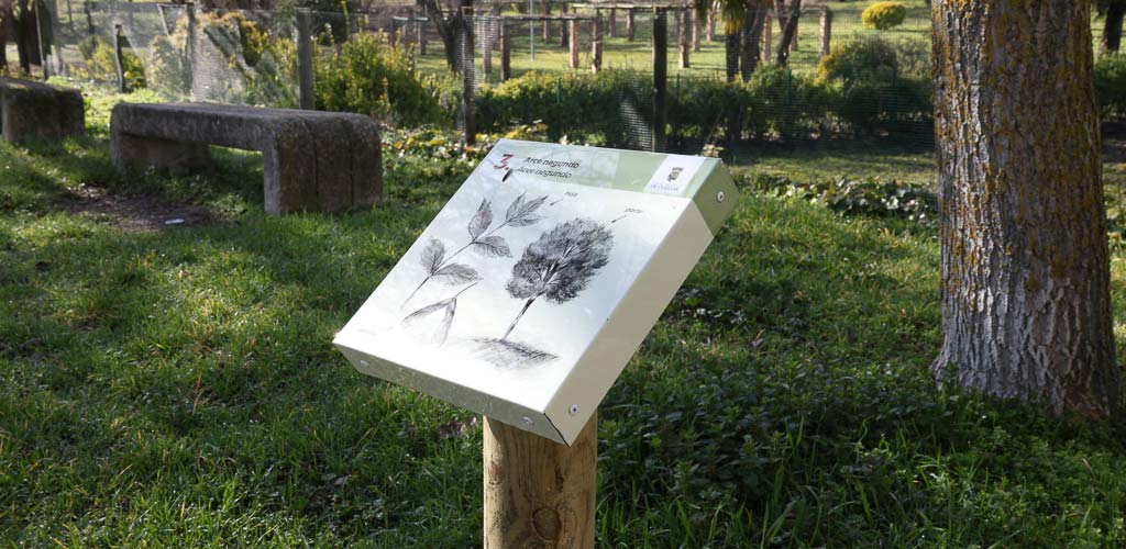 Las dos mesas ofrecen una vista general de dónde se encuentran los árboles y cada uno de ellos cuenta con un atril en el que Yagüe ha reflejado alguna de sus características: frutos, hojas… junto a su nombre y nombre científico.
