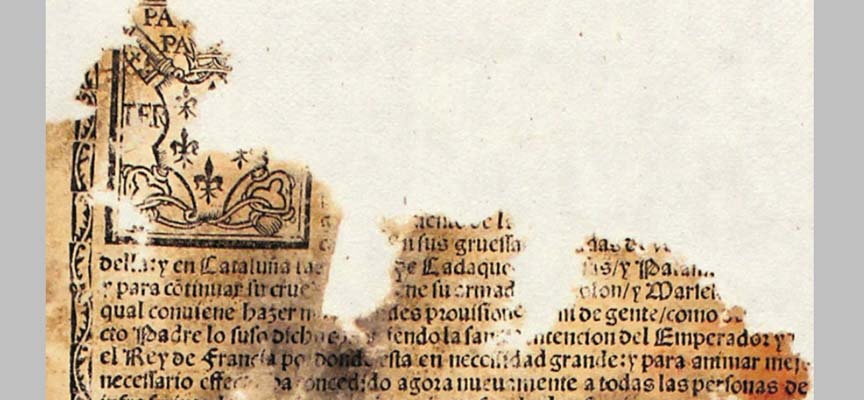 De la bula en cuestión se conservan cinco fragmentos, habiéndose perdido partes tan importantes como el título, la fecha y la firma del responsable. Se aprecia parcialmente el escudo de Paulo III (1534-1549), pero el arco temporal es demasiado extenso. Sin embargo, las menciones a Cataluña, Cadaqués y Palamós, además de al rey de Francia se refieren a un contexto histórico muy definido: el ataque del pirata Barbarroja, en connivencia con Francisco I, a la Costa Brava y Valencia saqueando y quemando una parte de las localidades, entre las que se encuentran las citadas. Esto sucedió en octubre de 1543 y obligó al papa a conceder una nueva bula de Cruzada para contribuir a los gastos que suponía la defensa contra el turco. Las fuentes citan esta concesión, por tres años, entre finales de diciembre de 1543 y principios de 1544, por lo que la impresión y predicación de la bula hubo de ser necesariamente de este último año o posterior. A falta del hallazgo, en alguna otra biblioteca, de un ejemplar completo que aporte más datos, se mantiene el año de 1544. Existe alguna de contenido similar, de 1546, en la Universidad Complutense, parte de cuyo texto describe las “hazañas” de los otomanos aliados con los franceses: “matando cruelmente mucho número de hombres, cautivándolos, deshonestando las mujeres y doncellas, talando los campos, quemando las cosas, destruyendo los lugares como parece en todas estas costas de Cataluña y Valencia y reinos de Nápoles y Sicilia…”.