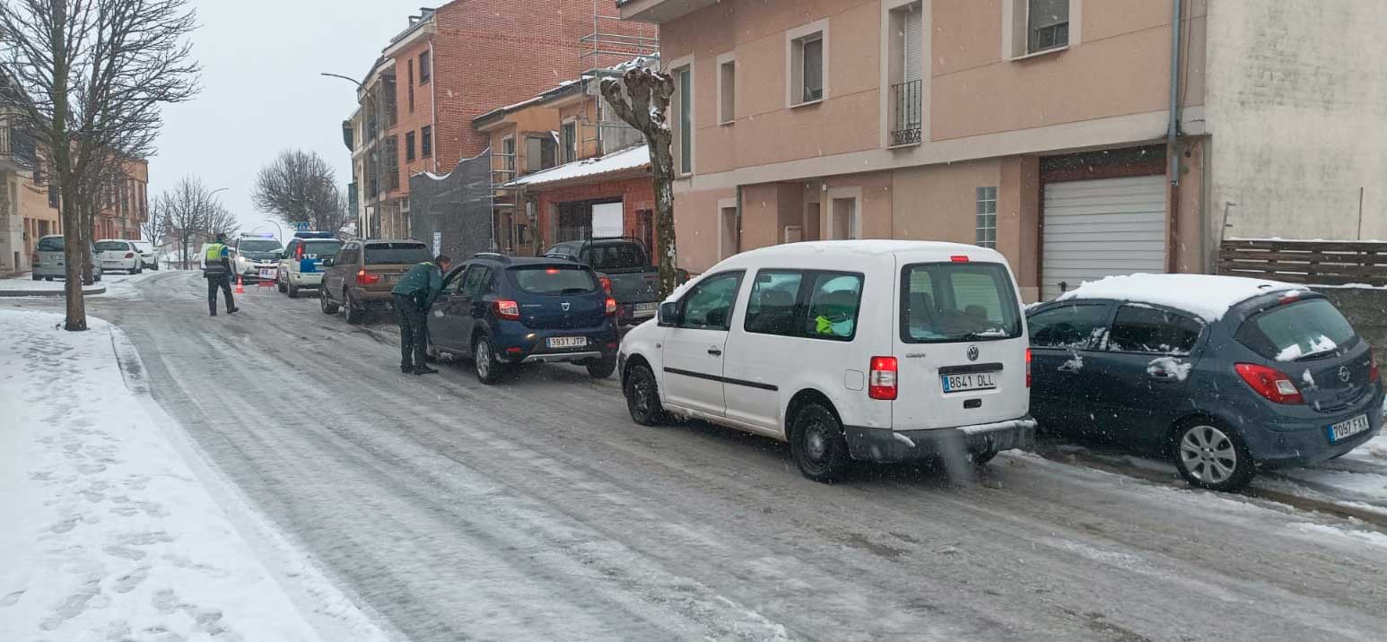 El paso de la borrasca Kristin está complicando el tráfico rodado y peatonal en las calles de Cuéllar a primera hora de la mañana llevando al corte de algunas de ellas como la avenida Camilo Jose Cela, la calle Valdihuertos y la calle Cubo. La nieve sigue cayendo de forma copiosa en el municipio.