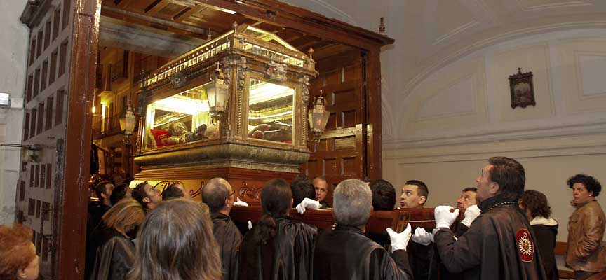 Entrada del Cristo Yacente en la iglesia de San Miguel tras la procesión de Viernes Santo. | Foto: Gabriel Gómez |