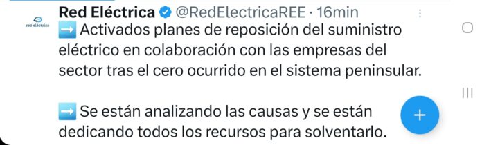 Red Eléctrica informa en su cuenta de X de que se están poniendo en marcha “planes de reposición del suministro eléctrico en colaboración con las empresas del sector tras el cero ocurrido en el sistema peninsular”.
