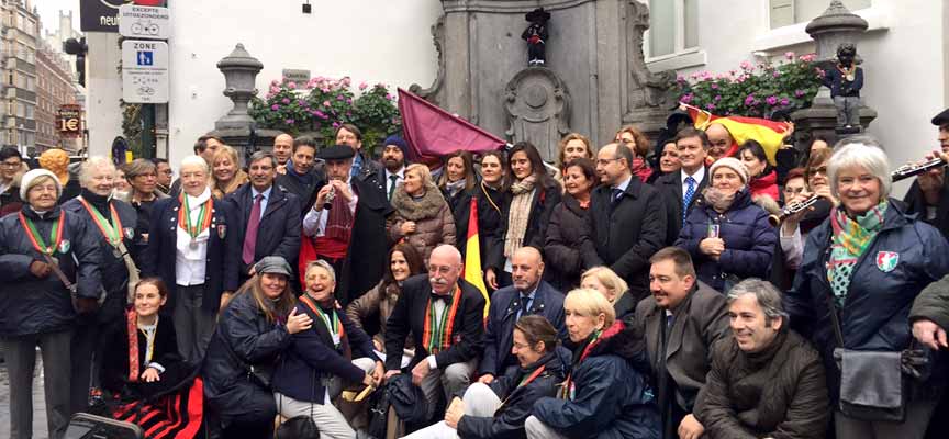 Segovianos ante el Manneken Pis tras vestirlo de segoviano en 2017.