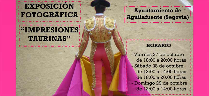 El fin de semana del 27 al 29 de octubre va a tener lugar en el vestíbulo del Ayuntamiento de Aguilafuente la exposición ‘Impresiones taurinas’, que combina fotografías taurinas y fragmentos de textos literarios.