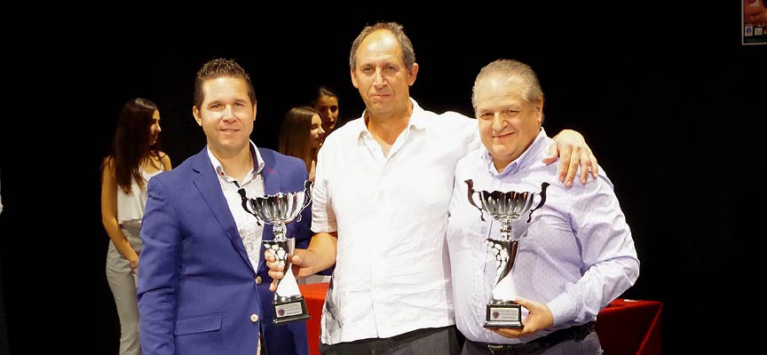 | Raúl Baeza (centro) recogiendo el premio en la Gala de la Pelota de Castilla y Léon 2018 |