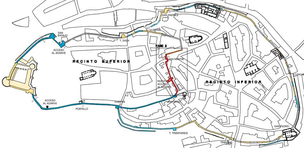 El proyecto abarca el tramo del recinto superior que se desarrolla entre la restaurada torre de Santiago, pasando por la llamada torre de la Muela y por la puerta de San Martín, hasta llegar a la plaza del Estudio, donde existe un tramo desaparecido de muralla. En total 150 metros de longitud en los que la muralla recuperaría su altura original. Incluye, además de los trabajos de consolidación, restauración y puesta en valor de los lienzos, la habilitación del adarve transitable desde la torre de Santiago hasta la puerta de San Martín, con un nuevo acceso al camino de ronda desde la calle.