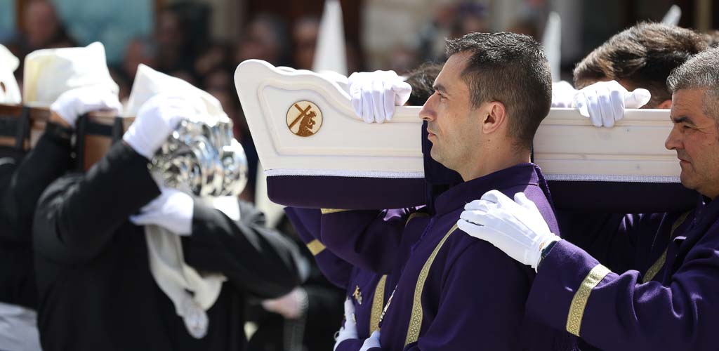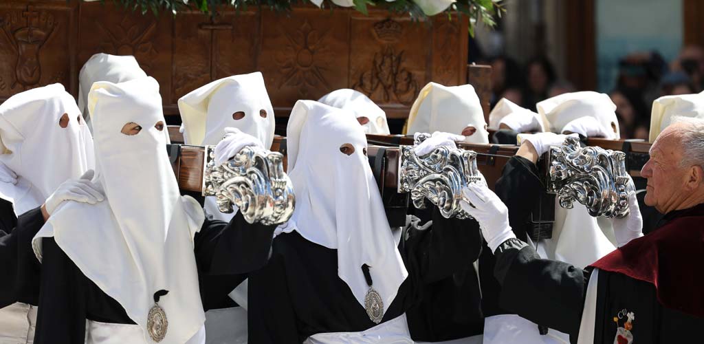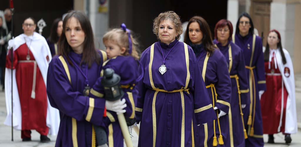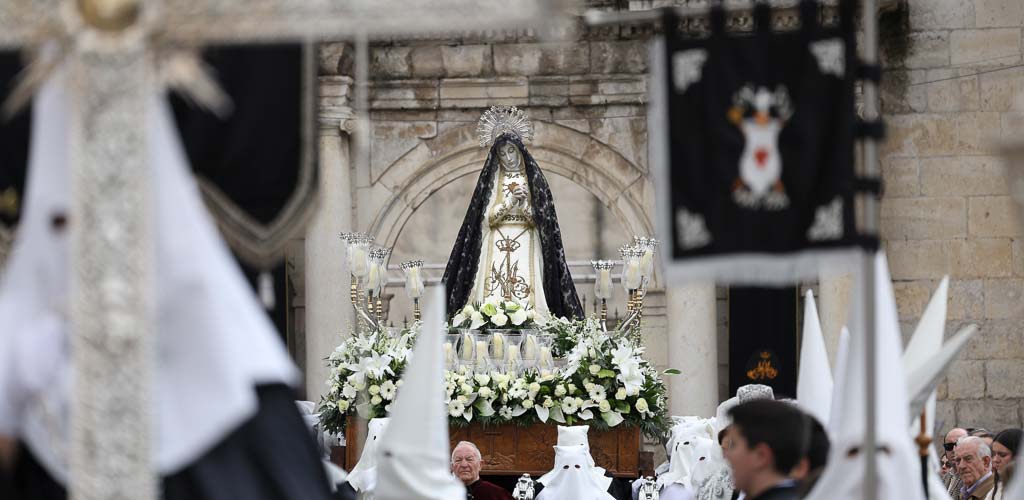 Los cofrades llevaban el capuchón en color crema, como el manto de gloria de la Virgen. Un manto que lucirá en su hornacina de la iglesia de San Miguel durante los 50 días de Pascua.