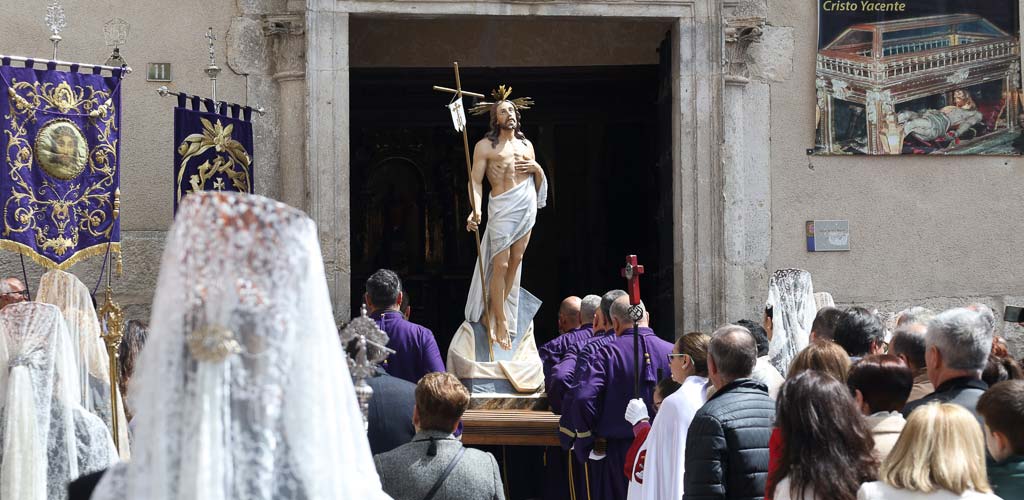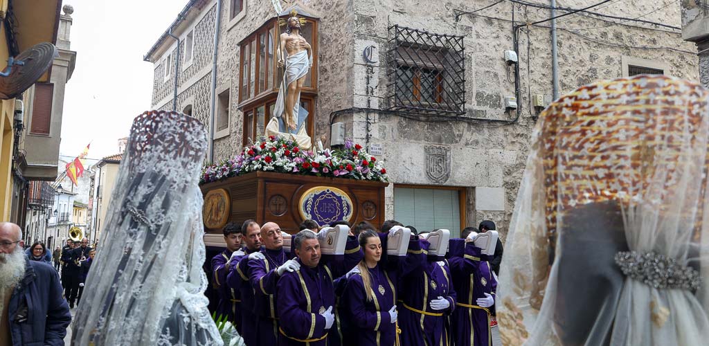 A las 11.30 horas la imagen de Cristo Resucitado partía portada en andas por penitentes de la Cofradía de Jesús Nazareno desde la iglesia de El Salvador. Un nutrido grupo de manolas la acompañaban en su recorrido, además de la banda de cornetas y tambores de la cofradía. Las calles Arévalo, Segovia, Trinidad y Santa Marina han sido su recorrido hasta la plaza Mayor.