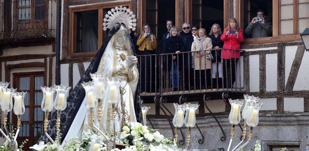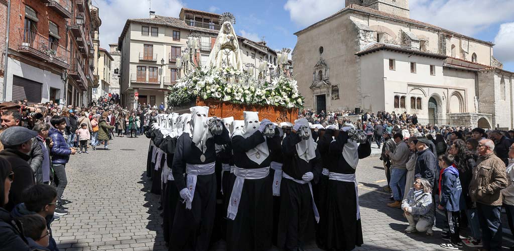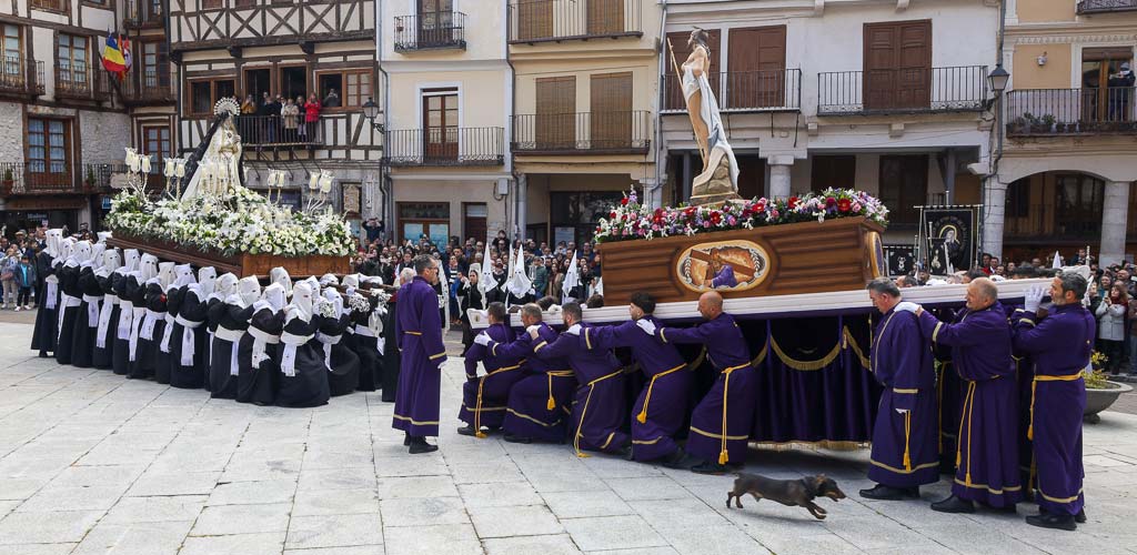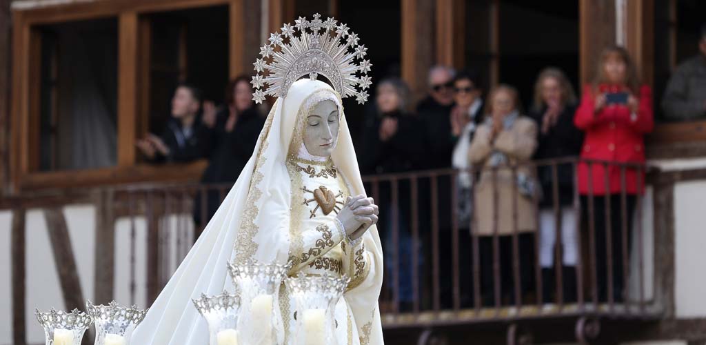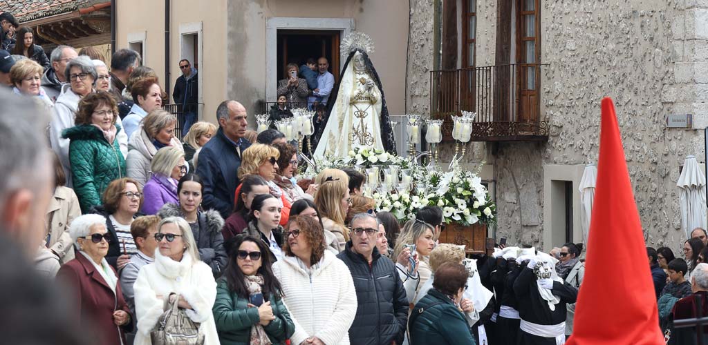Las campanas de la iglesia de San Miguel de Cuéllar han tañido y en la plaza Mayor ha resonado un aplauso cuando la Virgen de La Soledad se ha despojado de su mantilla negra, luciendo el manto de gloria tras el encuentro con el Resucitado. Una procesión con la que se ha puesto el punto final a una Semana Santa cuyo desarrollo ha estado marcado por la climatología que impidió el desarrollo de la procesión del Viernes Santo y en la que la lluvia ha estado presente en diferentes momentos.