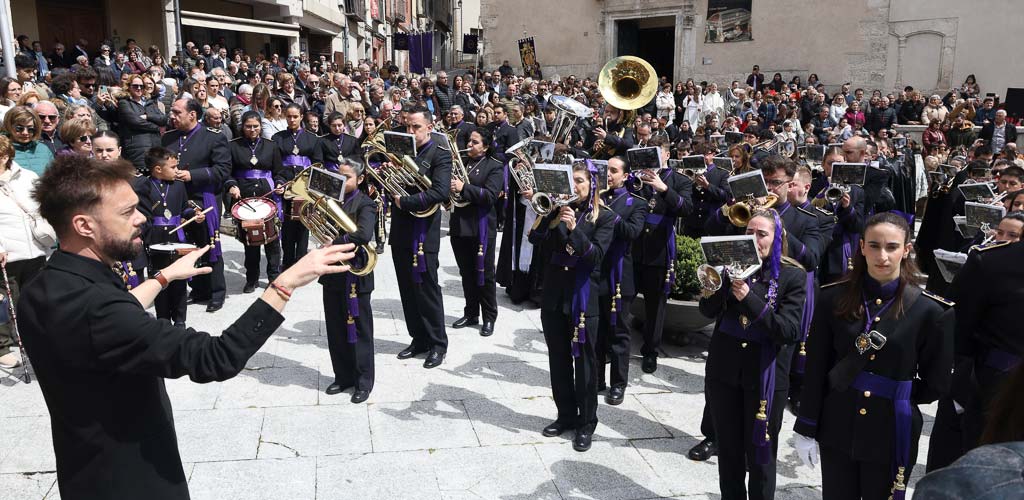 La plaza Mayor ha sido el punto con mayor concentración de público para presenciar el encuentro entre ambas imágenes que se ha producido en el centro de la plaza, un espacio que previamente han ocupado las bandas de ambas cofradías que han actuado juntas.