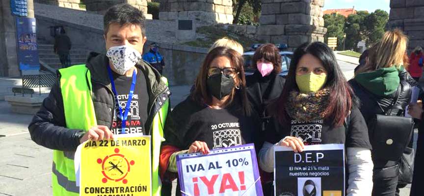 Peluquerías cuellaranas se han sumado hoy a los pies del Acueducto de Segovia a una nueva concentración de propietarios y trabajadores de peluquerías y centros de estética en la que han puesto de nuevo de manifiesto “la dramática situación de un sector sometido a una doble crisis, una provocada por la sangría fiscal que supone soportar un IVA injusto al 21% desde 2012, y otra por la enorme caída de la actividad y facturación de los salones derivada de la crítica situación sanitaria y económica actual”.