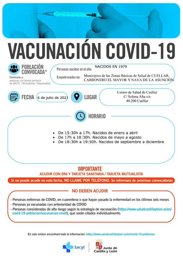 En el punto fijo de vacunación del centro de salud de Cuéllar, al que deben dirigirse los ciudadanos de las zonas básicas de salud de Cuéllar, Carbonero el Mayor y Nava de la Asunción, se incorporará cada día de la semana, de lunes a jueves, a un nuevo grupo de edad: el lunes, los nacidos en el segundo semestre de 1977 y en 1978; martes, 1979; miércoles, 1980; y jueves, 1981. El viernes, 9 de julio, se vacunará a los nacidos en el primer semestre de 1982. Asímismo se continuarán administrando segundas dosis a lo largo de la semana a los ya vacunados.