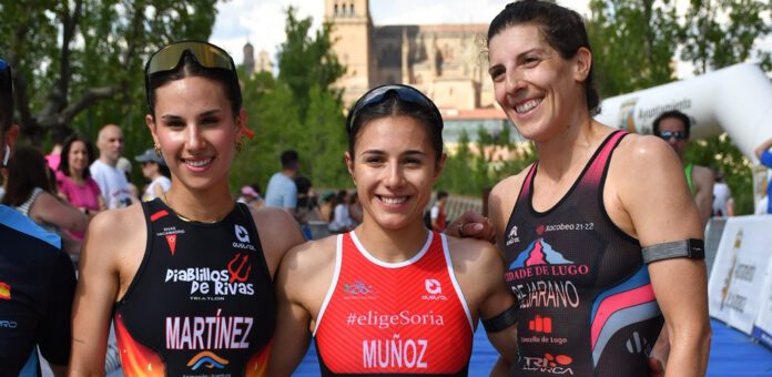 En la prueba femenina, máxima igualdad entre las que conformaron el podio final. Con apenas siete segundos cubrieron los primeros 5.000 metros de carrera y llegaron al box Carla Martínez (Diablillos de Rivas), Sonia Bejarano (Triatlón Cidade de Lugo Fluvial) y Marina Muñoz (Deporama Triatlón Soriano), que salieron al sector ciclista también casi a la vez. Fue sobre la bicicleta donde la cuellarana ha marcó la diferencia y fue incrementando una ventaja que se fue por encima del minuto y medio sobre sus inmediatas competidoras cuando volvió al box.