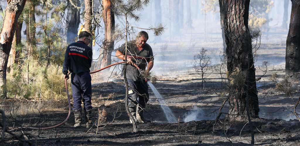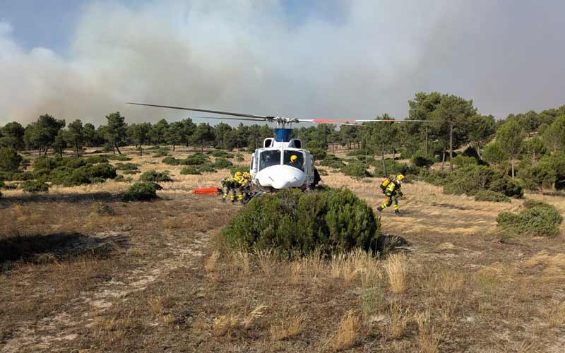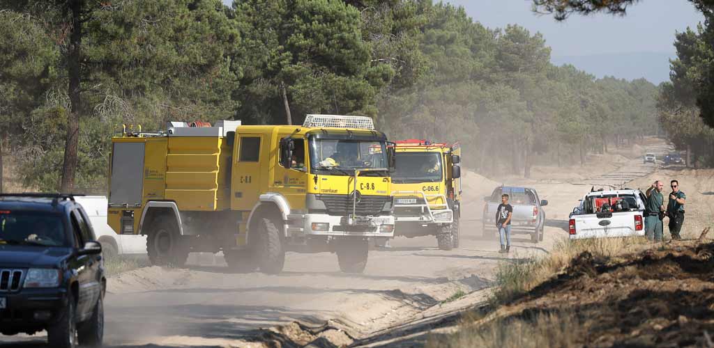 Hasta el lugar se han desplazado dos técnicos y cinco agentes medioambientales, tres cuadrillas terrestres, compuestas por un equipo de cinco peones, un peón especialista y un capataz con dos vehículos, uno todo terreno y otro vehículo pick-up; cuatro autobombas; un bulldozer y cuatro cuadrillas helitransportadas. También, están interviniendo siete helicópteros e hidroaviones, y junto a ellos efectivos de Protección Civil Cuéllar para distribuir agua entre el personal, los vehículos de extinción de la Comunidad de Villa y Tierra de Cuéllar junto a su personal voluntario y la baldeadora municipal.