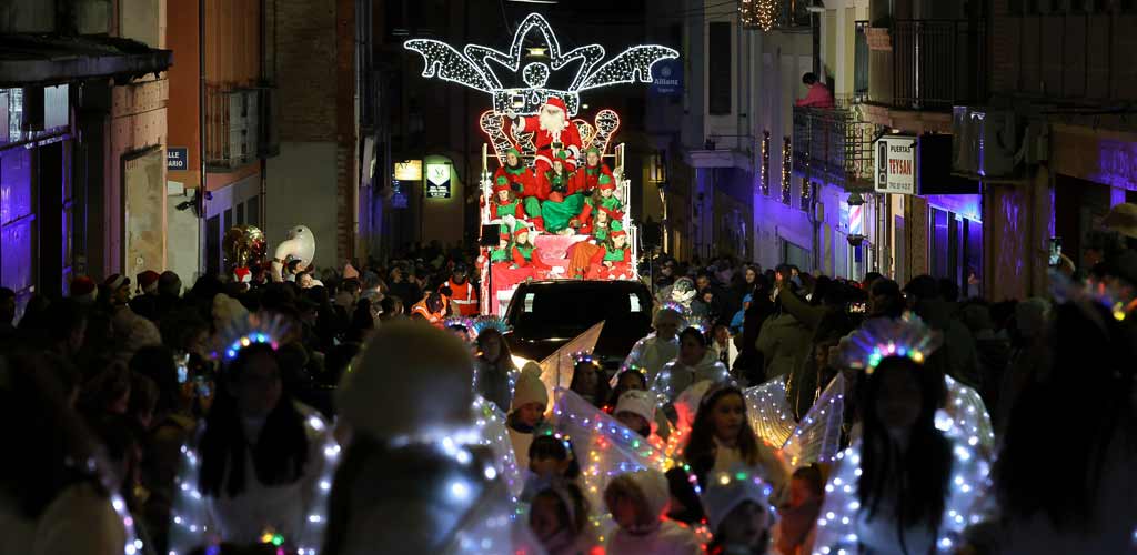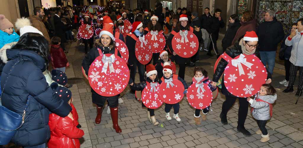 La Banda Municipal de Música ha amenizado la espera de la llegada del pasacalles con su música navideña desde la plaza de los Coches y allí se han sumado a la comitiva los niños y familias junto a cinco pequeñas carrozas. Bolas de Navidad, árboles, muñecos de nieve, renos… todos ellos han aportado colorido al pasacalles.