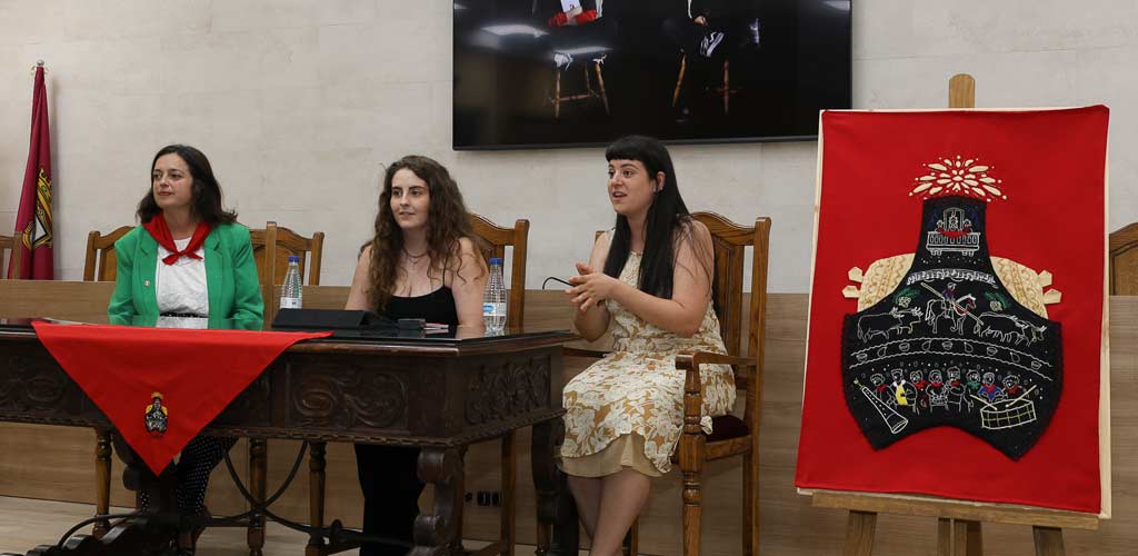 Una montera bordada a mano es el motivo central del repostero que han elaborado estas jóvenes diseñadoras especializadas en dirección de arte. En su interior destacan los elementos más significativos de las fiestas de la villa, según detallaron en su exposición.