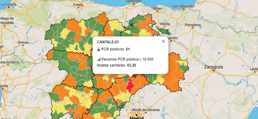 La de Cantalejo registra en los últimos siete días 61 positivos, dos más que el viernes, lo que supone que el 63,25 % de cada 10.000 personas con tarjetas sanitarias de esta zona han dado positivo en una primera prueba PCR. Esta tasa hace que la zona de salud briquera permanezca en color rojo en el mapa sanitario de la Junta de Castilla y León. En esta zona hay 167 casos activos, veintitrés más que el viernes. Desde el sábado tanto Cantalejo como Carrascal del Rio están sujetas a las medidas de contención que fueron fijadas el viernes por la junta, y ratificadas ayer por el juez.