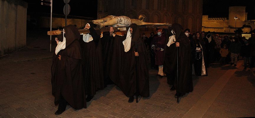El sonido de los tambores de la cofradía de La Soledad ha resonado en el recorrido y ha marcado la salida de la imagen del templo acompañada por sus cofrades vestidos con trajes de lana del siglo XVI en paño marrón. Precediéndoles, representantes del resto de cofradías de la villa y tras ellos el público portando velas encendidas. Desde el templo el recorrido ha continuado por la calle Rogativa y la calle Nueva hasta pasar bajo el arco de la muralla, y dejando a un lado el Castillo continuar por la calle Palacio. Allí han comenzado a escucharse cantos tradicionales de los Catorce Romances de la Pasión de Cristo de Lope de Vega, unos cantos típicos de esta época en la comarca y que aún se conservan en Chañe en su procesión de La Carrera en Jueves Santo. Los cantos han sonado de nuevo al atravesar el arco de San Martín acompañando el descenso de la imagen por la calle Duque de Alburquerque y Morería hacia la plaza Mayor.