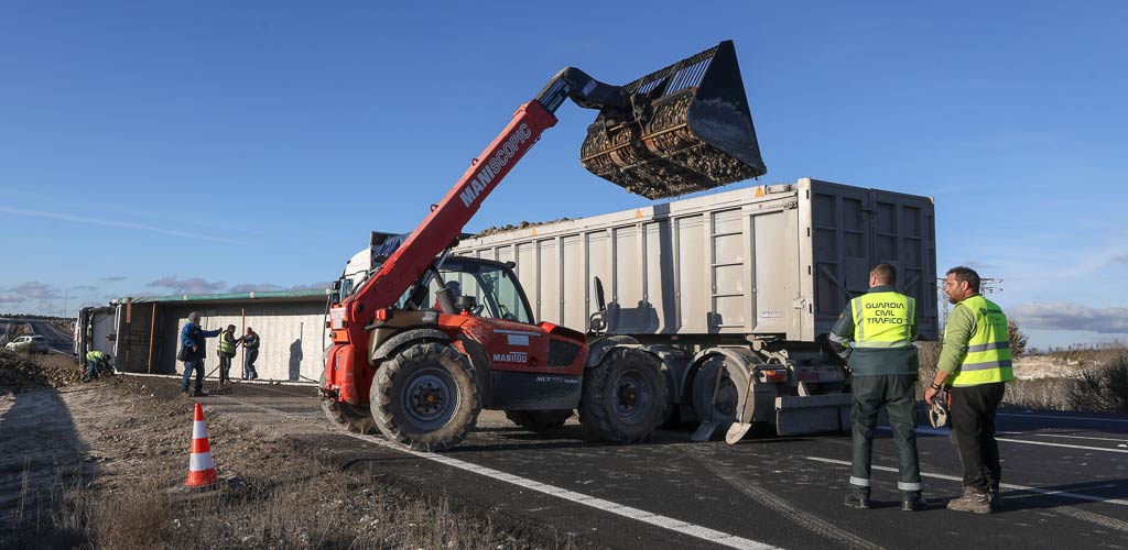 Un camión cargado de remolachas ha volcado en torno a las 14.15 horas de esta tarde al incorporarse a la autovía, A-601, desde la SG-223 en dirección Valladolid, en el kilómetro 53,400.