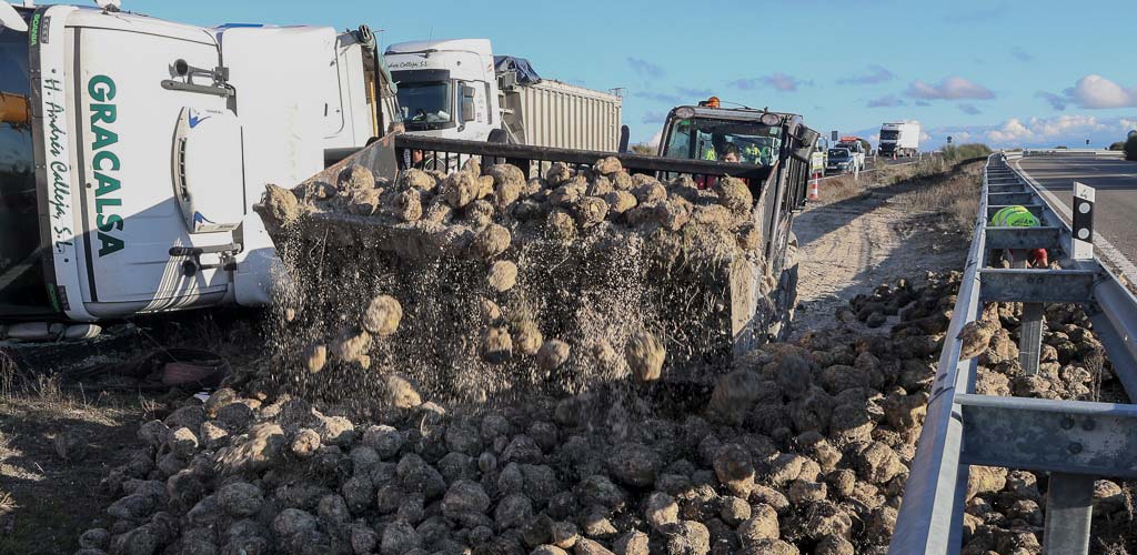 A las 17.20 horas se han iniciado los trabajos de retirada del camión de la calzada, mientras que las remolachas han sido recogidas y trasladadas a otro camión.