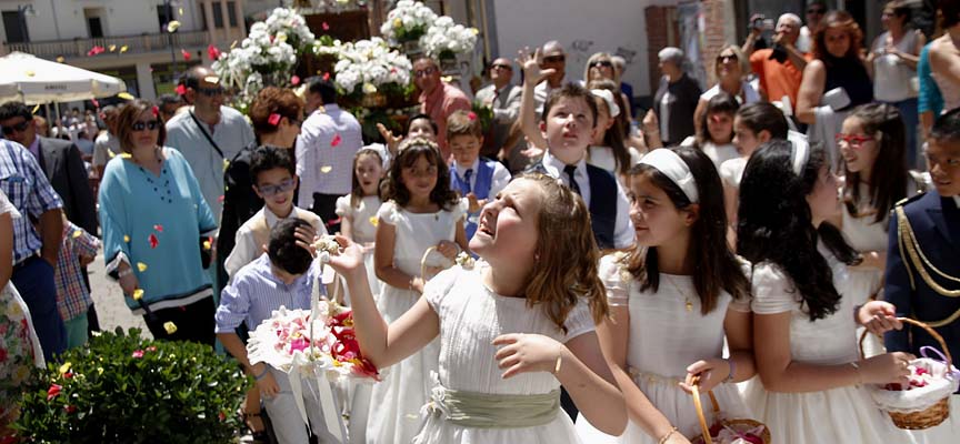 El medio centenar de niños que este año han tomado la Primera Comunión en Cuéllar han tenido hoy ocasión de rememorar ese día tan especial en la celebración del Corpus Christi.