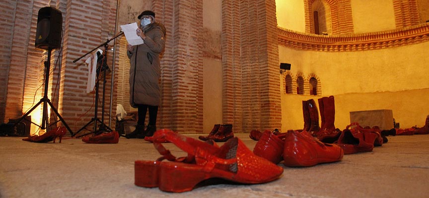 Treinta y siete pares de zapatos rojos, uno por cada mujer fallecida por violencia de género en 2021, han formado un gran lazo en lo que fuera el altar de la iglesia de San Martín de Cuéllar en este Día contra la Violencia de Género. Hasta el templo se han desplazado los actos, organizados por el Colectivo Feminista 8M y la concejalía de Igualdad, ante la previsión de lluvia, ya que inicialmente estaban previstos en la plaza Mayor.